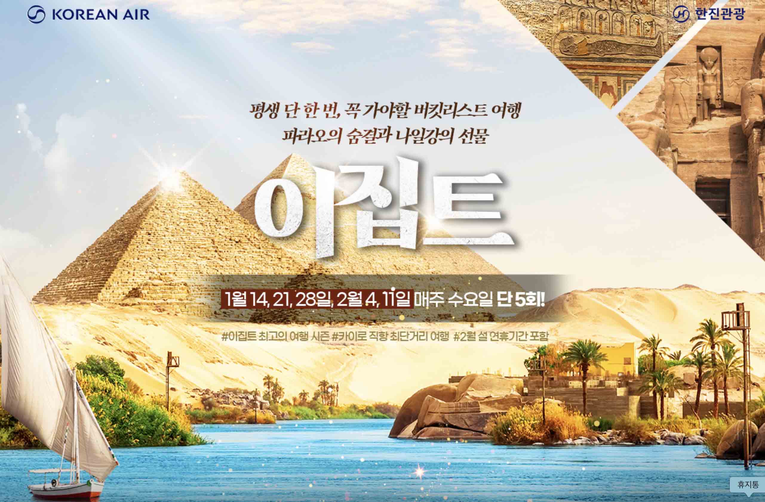 2026년 1월 14일부터 2월 11일까지 이집트행 대한항공 전세기(매주 수요일)가 5회 출발한다. 이번 전세기는 한진관광과 하나투어가 판매하며, 양사는 각각 매력이 다른 패키지 상품을 구성하고 기획전을 진행하고 있다.