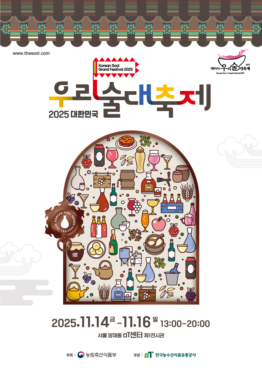 대한민국 우리술대축제는 전통주의 가치와 다양성을 널리 알리고 국내외 소비자와의 소통을 강화하기 위해 마련된 국내 최대 규모의 전통주 축제다. 2025년 축제는 서울 양재동 aT센터 제1전시관에서 11월 14일부터 16일까지 3일간 개최되며, 전국 각지의 우수한 전통주를 한자리에서 만날 수 있다.
