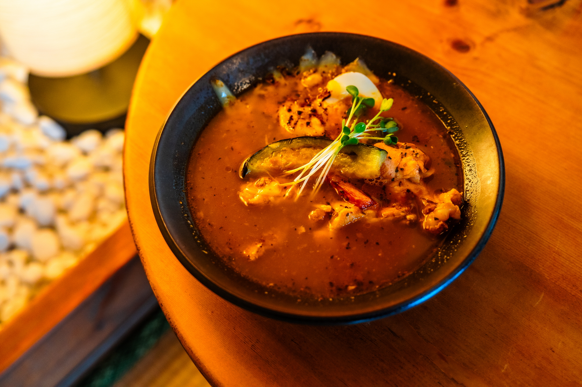 사장님은 삿포로에서 직장을 다닐 때 스프카레를 자주 먹었는데, 직접 만들어 보고 싶어 독학으로 요리를 시작했고 식당을 차렸다. 대표 메뉴는 치킨 야채 카레(새우스프)에 구운 치즈를 곁들인 것. 바삭하게 튀긴 채소와 부드럽게 삶아진 치킨이 잘 어울리고, 치즈와의 궁합도 뛰어나다. |