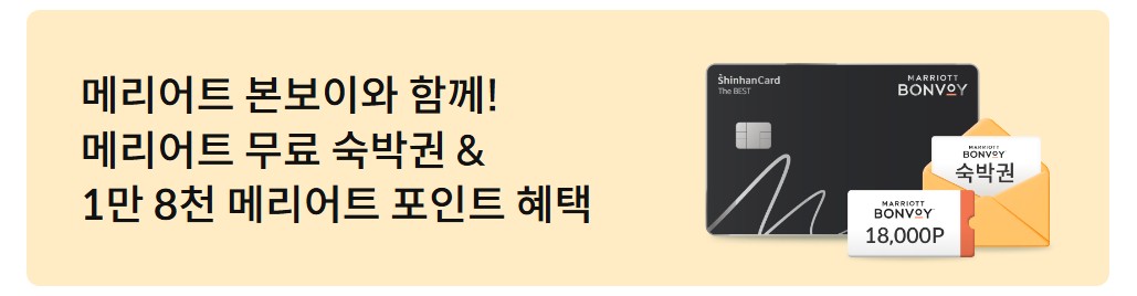 포인트 인플레이션으로 가성비가 조금 아쉬워졌지만, 여전히 활용도가 높은 카드다. 신한카드가 메리어트 본보이 더 베스트 신한카드 1박 무료 숙박권 & 1만5,000포인트 제공 이벤트를 진행 중이다.